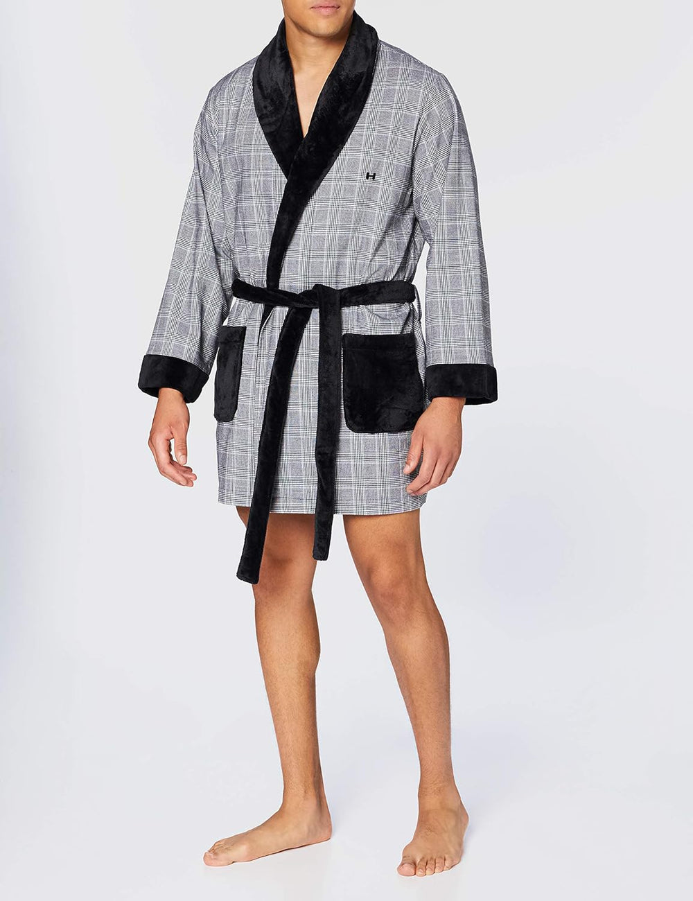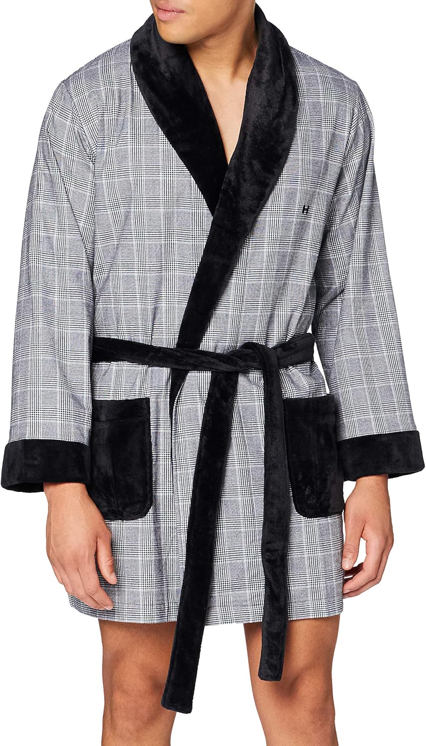 HOM Herren Bademantel 'Benjamin' Wellness Hausmantel kariert L Schwarz, L Schwarz