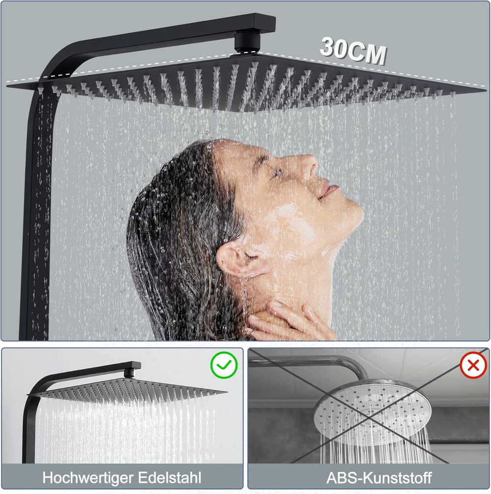 HOMELODY Duschsystem mit Thermostat Schwarz - Edelstahl Duscharmatur Komplettset mit 30x30CM Kopfbra