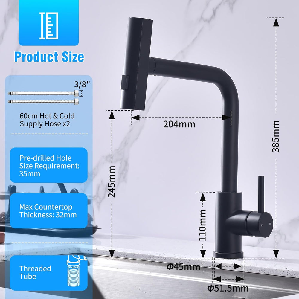 HOMELODY Wasserhahn Küche Schwarz, Küchenarmatur Ausziehbar mit 3 Strahlarten, Spültischarmatur mit