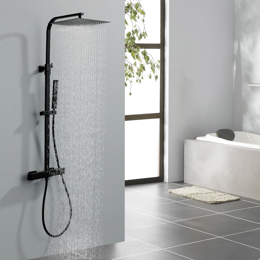 HOMELODY Duschsystem mit Thermostat und Glasablage Schwarz - Duscharmatur Komplettset mit 30x20 cm R