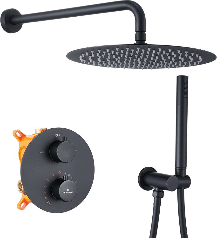 HOMELODY Schwarz Duscharmatur Regendusche Unterputz Duschsystem mit Thermostat,Unterputz Duscharmatu