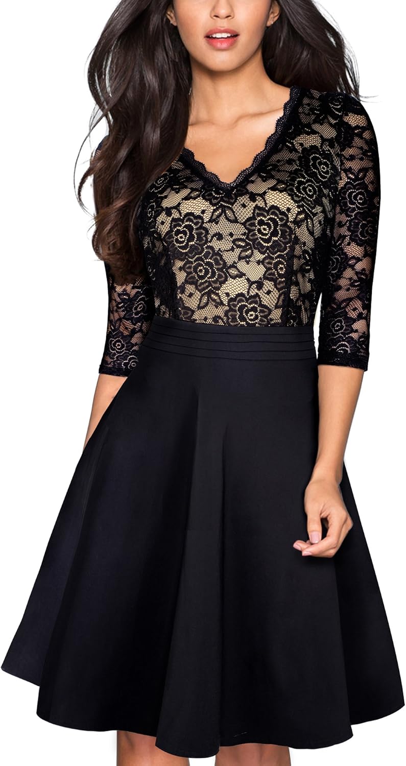 HOMEYEE Damen Vintage 3/4 Ärmel Floral Spitze Gestickte Cocktail Ausgestelltes Kleid A062 M Schwarz,
