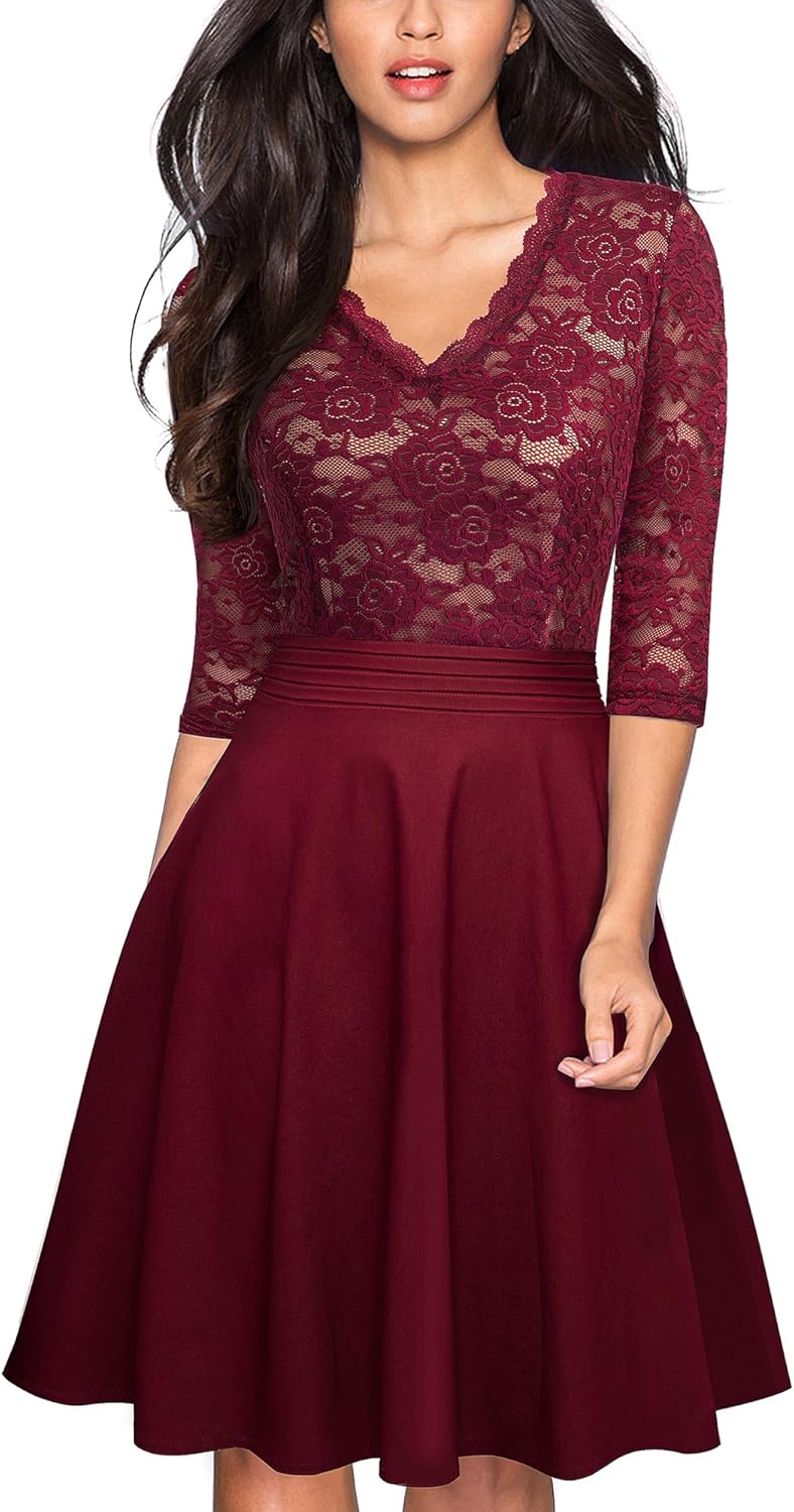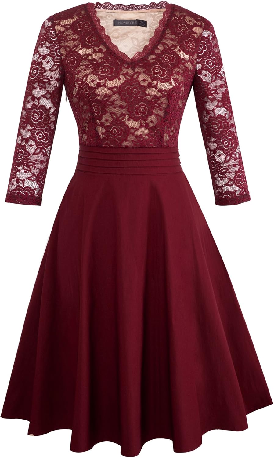 HOMEYEE Damen Vintage 3/4 Ärmel Floral Spitze Gestickte Cocktail Ausgestelltes Kleid A062 S Wein02,