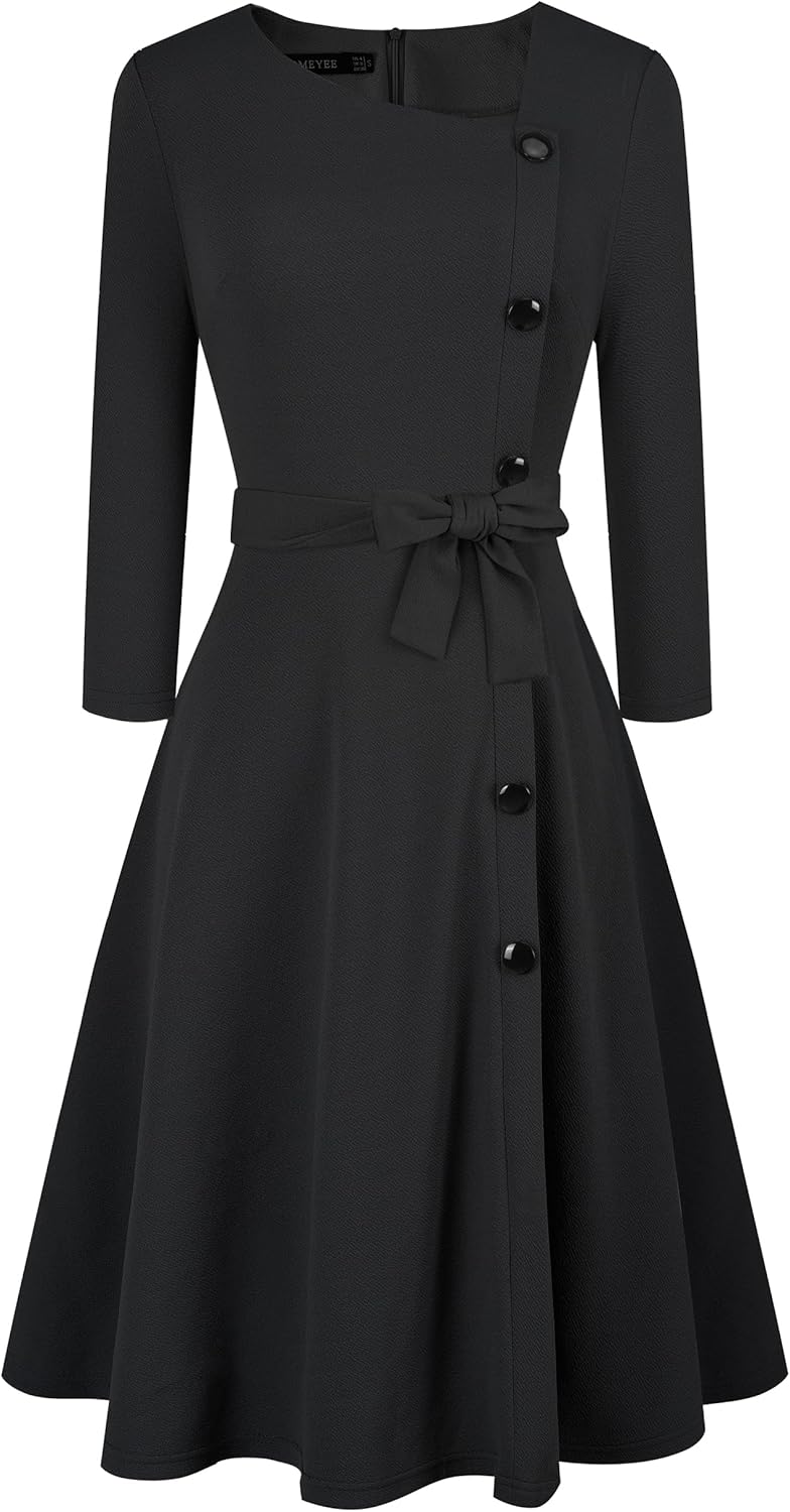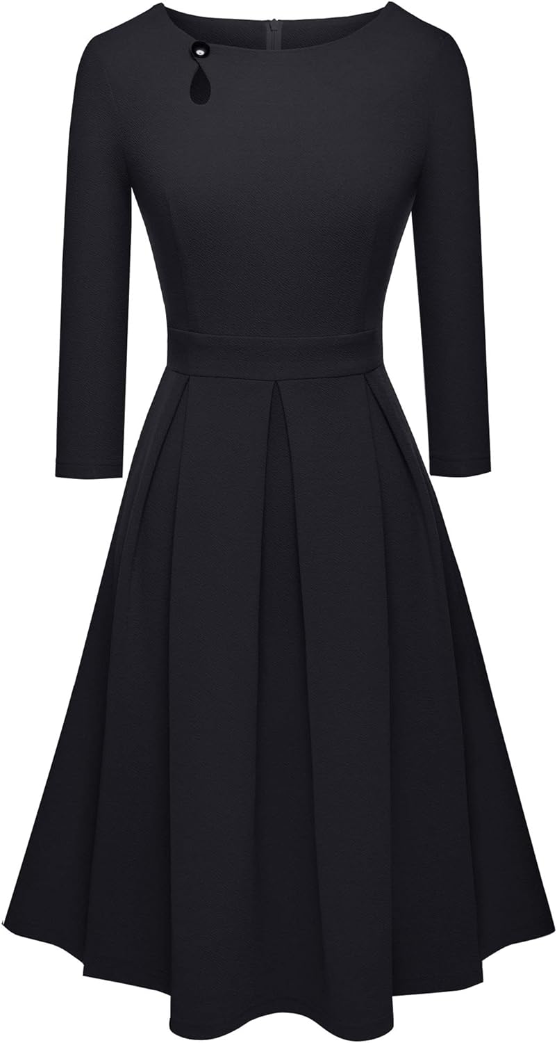 HOMEYEE Damen Vintage Aushöhlen Rundhals Abgefackelt Plissee Cocktailkleid A223, L Schwarz