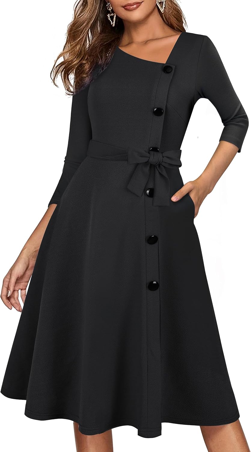 HOMEYEE Damen Elegant V-Ausschnitt 3/4 Ärmel Kleider für Hochzeit Knielang Vintage Party Cocktailkle