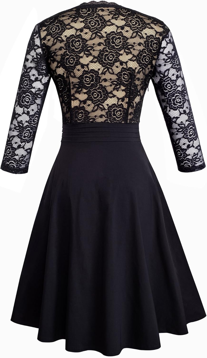 HOMEYEE Damen Vintage 3/4 Ärmel Floral Spitze Gestickte Cocktail Ausgestelltes Kleid A062, S Schwarz