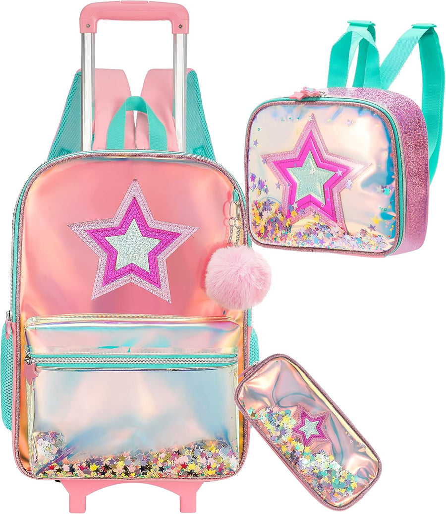 HTgroce Schulranzen mit Rollen für Mädchen Pop it Rucksack 16 Zoll Set 3 in 1 mit Lunch Bag Kinderga