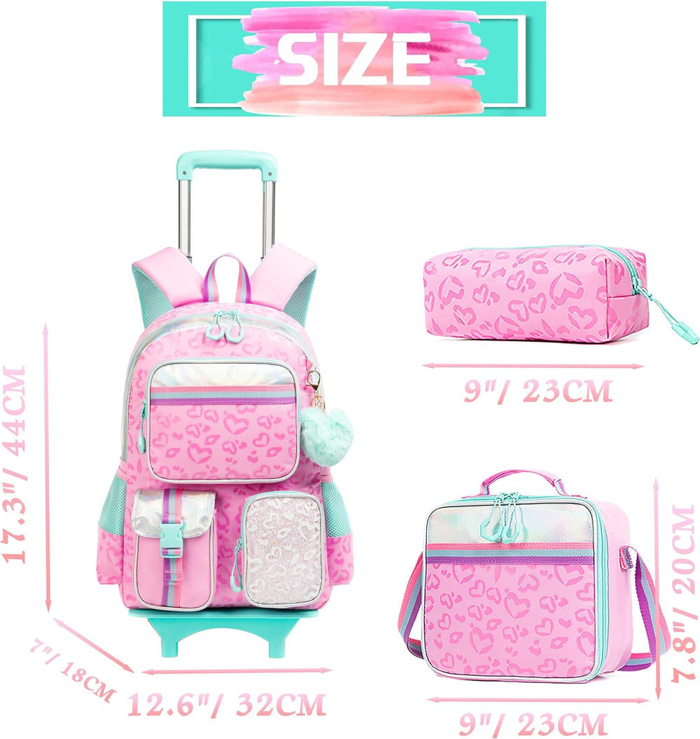 HTgroce Rollrucksack Schulranzen mit Rollen für Mädchen Pop it Rucksack 16 Zoll Set 3 in 1 mit Lunch