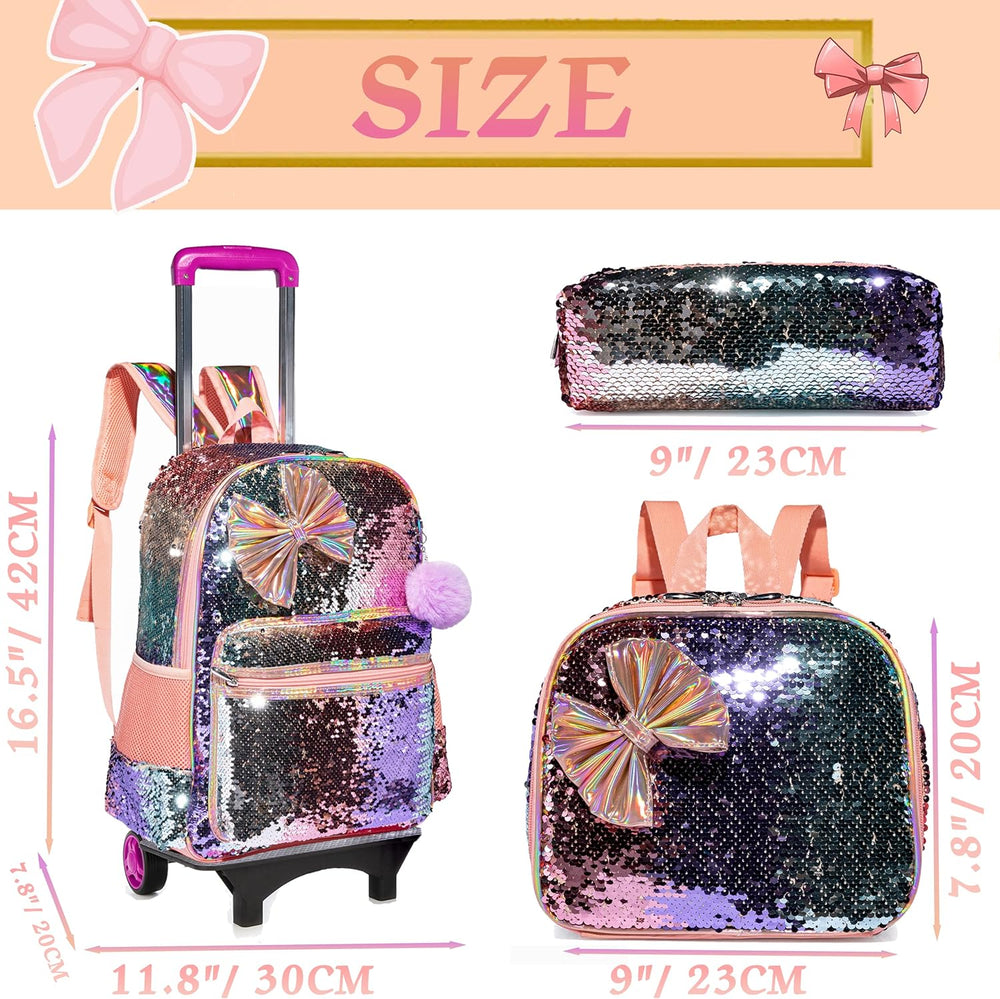 HTgroce Lila Liebe Trolley Rucksack mit Rollen, Federmäppchen, Lunch Tasche 3 in 1 Pailletten Rollin