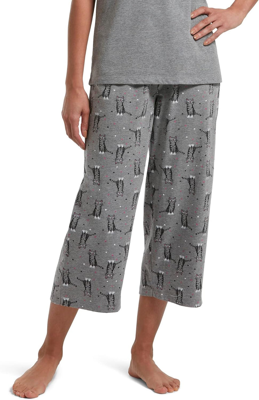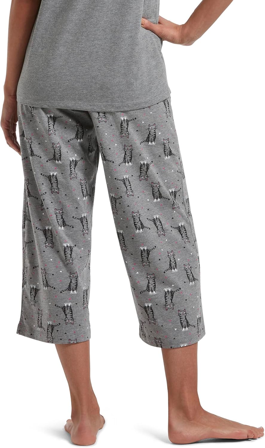HUE Damen Printed Knit Capri Pajama Sleep Pant Pyjamahose, Medium Grey Heather/Sweet Kitty