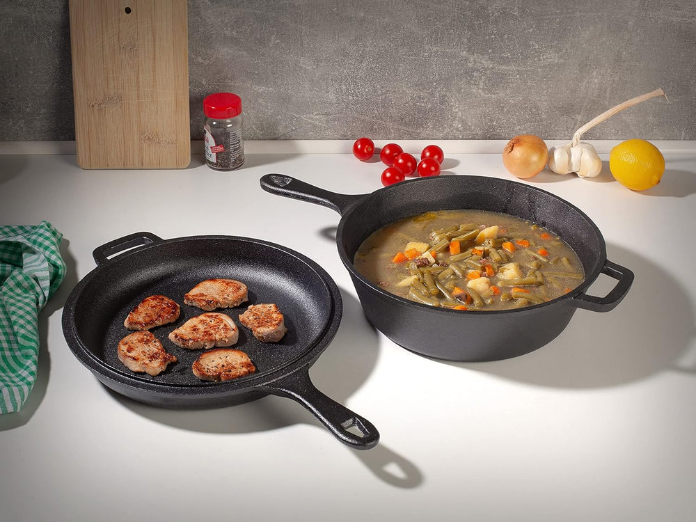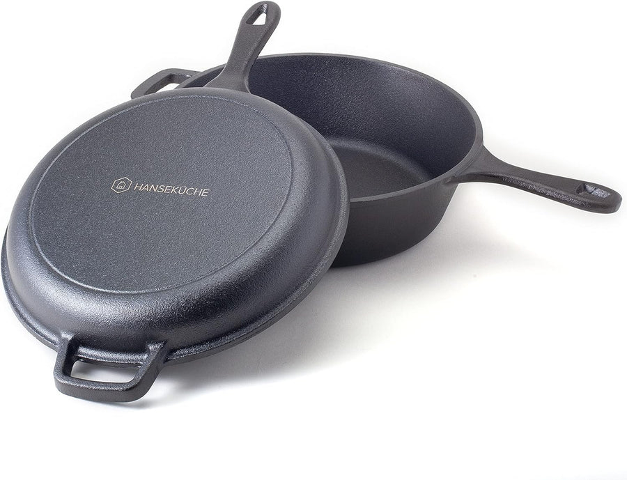 Hanseküche Gusseisen 2in1 Topf mit Pfannendeckel – Hochwertiger Bräter mit Pfanne, Ø 26 cm, bereits