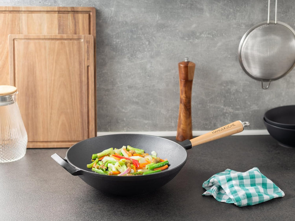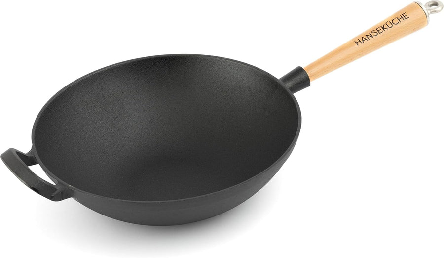 Hanseküche Gusseisen Wok – Hochwertige eingebrannte Wokpfanne, induktionsgeeignet – Robuste und rust