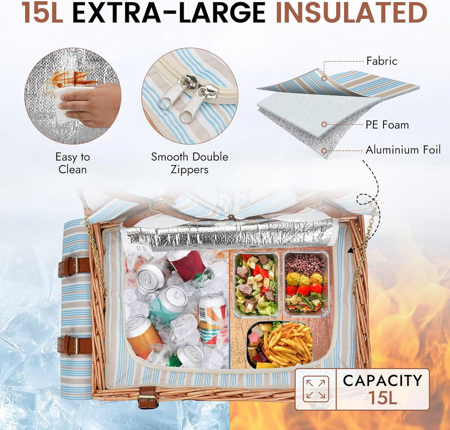 Picknickkorb Set für 2 Personen, Weidenkorb mit grossem isoliertem Kühlfach, wasserdichter Decke und