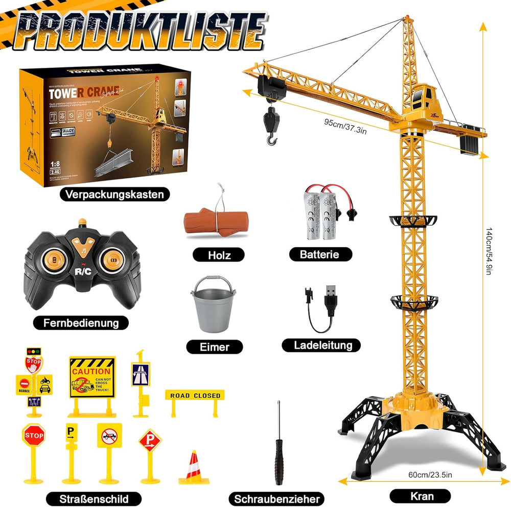 Herenear Ferngesteuerte Kran Spielzeug, 140 cm Hohe Spielzeug Kran Mit Hebehaken, 360° Drehung, Lich