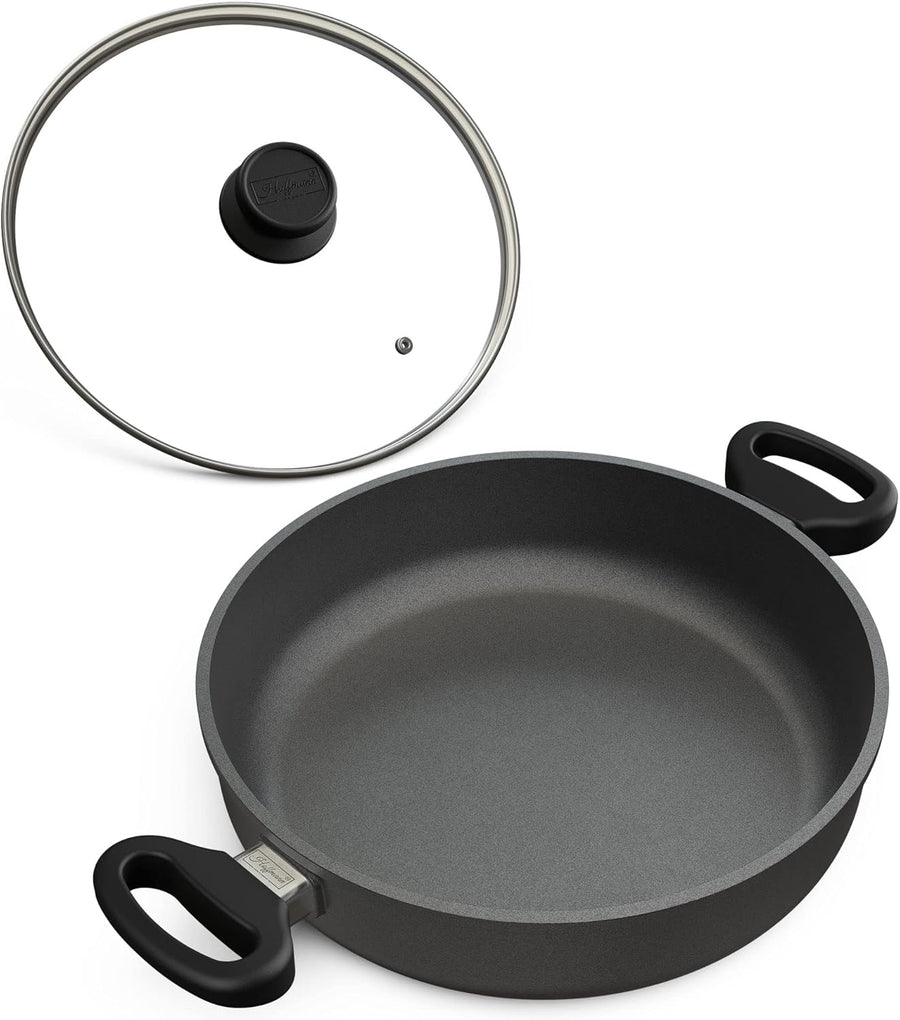 Hoffmann Aluguss Bratpfanne 28 cm Induktion mit Deckel 4,5 cm Innenhöhe I Made in Germany I Hoher Ra