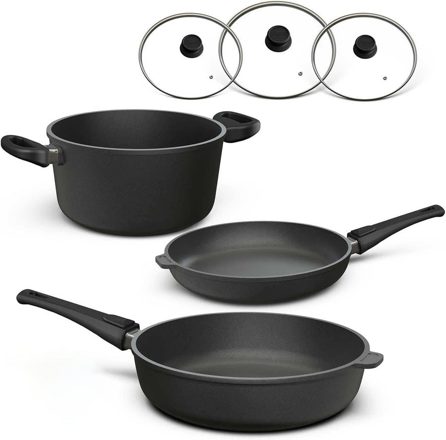 Hoffmann Aluguss Topf und Pfannenset mit Glasdeckel und abnehmbarem Stiel, 6-teilig I Für alle Herda