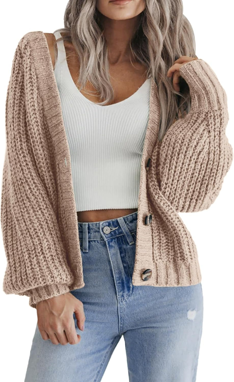 Hotouch Strickjacke Damen Kurz Strick Cardigan V-Ausschnitt Knopfleiste Open Front Sweater Elegant C