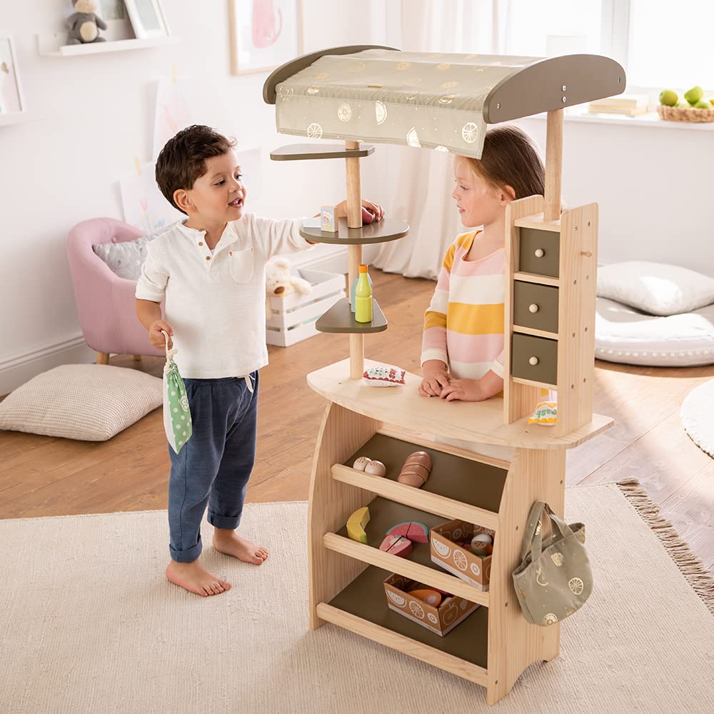 howa Kaufladen Marktstand "Lucky" aus Holz mit Markise, Tasche und 32 tlg. Kaufladenzubehör 47479