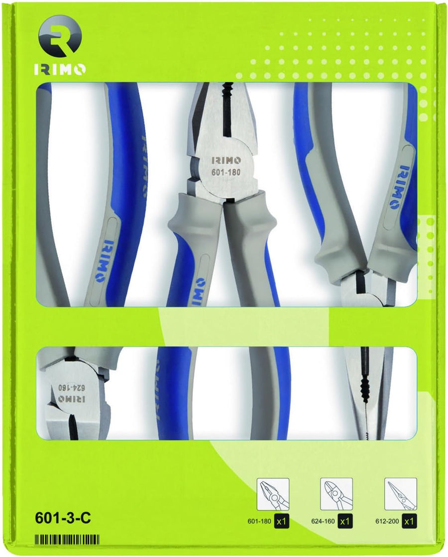 Juego 3 alicates (universal 180mm, cortante 160mm, semirredondo 200mm)