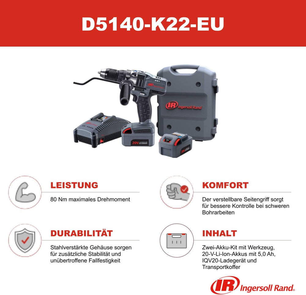 Ingersoll Rand Akku Bohrmaschine/Schrauber D5140-K22-EU, 1/2-Zoll 20V, 2x BL2022 Li-Ion-Akkus 5,0 Ah