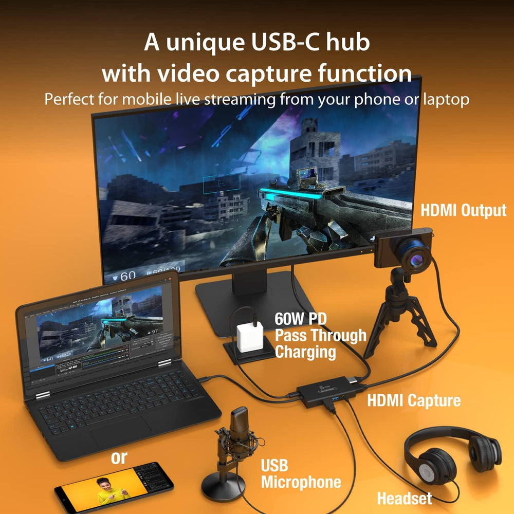 j5create Video Capture Card mit PD 60W Pass-Through Charging, integrierter Multifunktions-Hub, geeig