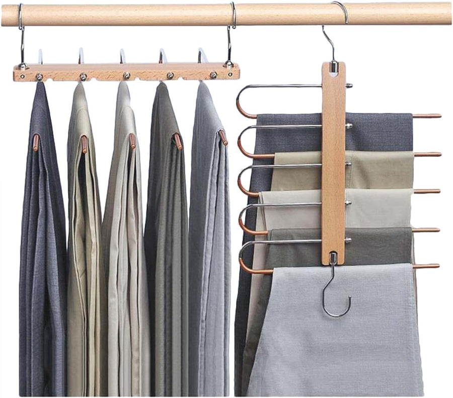 2 Stück 5in1 Hosenbügel Platzsparend,Edelstahl Hosenbügel rutschfeste Robuster, Holz Hosenkleiderbue