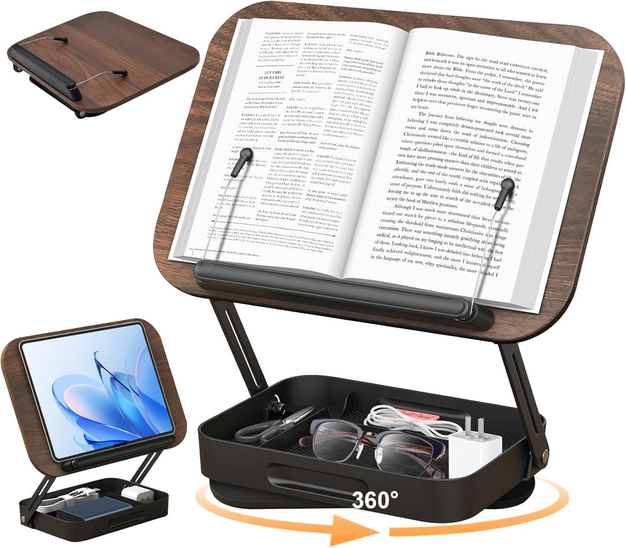 JNUYISW Buchständer Holz, Verstellbarer Buchhalter Leseständer zum Lesen mit 360° Drehbare Basis Fal