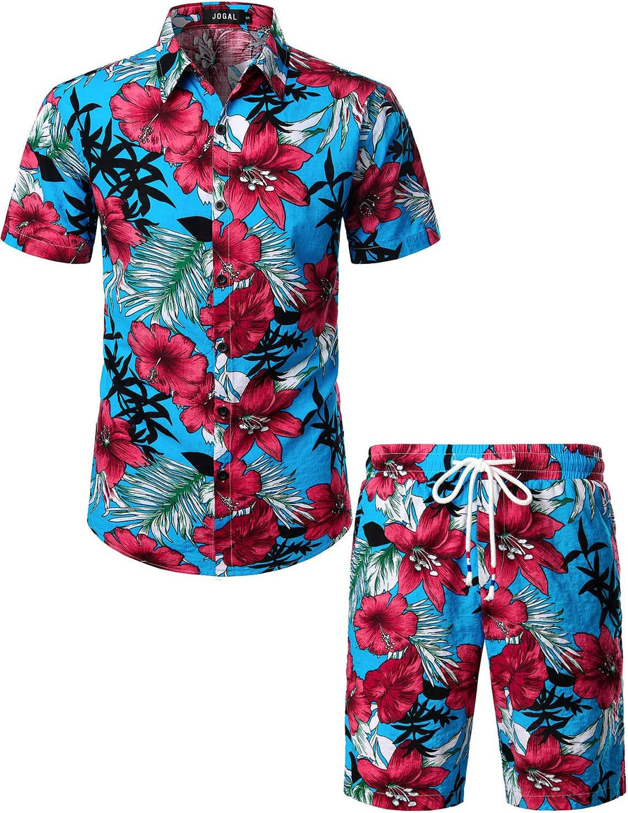 JOGAL Herren Hawaii Hemd Männer Flamingo Kurzarmhemd und Kurze Hose Set Strand Outfit Sommerhemd Für