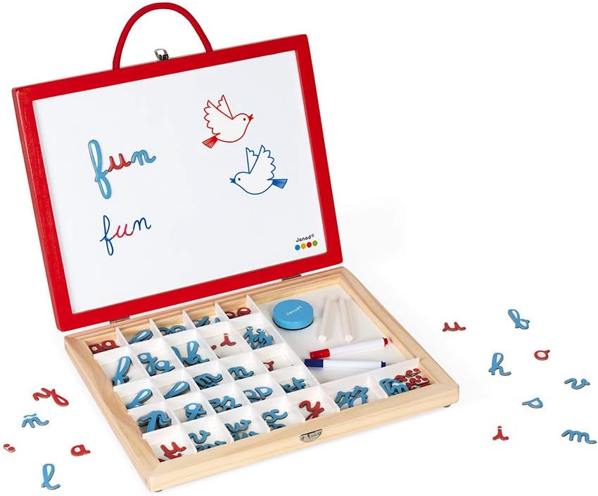 Janod - Essentiel - 4-in-1 Schreibkoffer aus Holz - Lernspiel - Buchstaben und Lesen lernen- 110 Zub