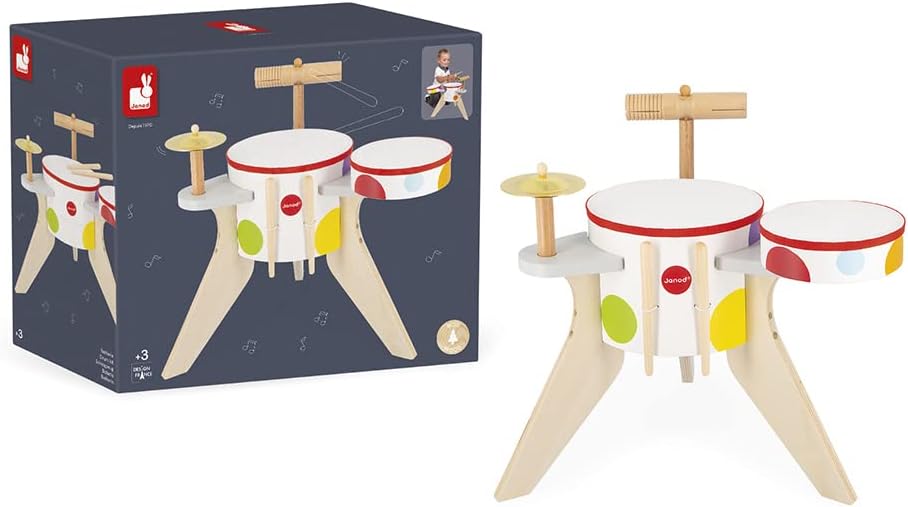 Janod - Confetti Schlagzeug aus Holz - Rollenspielzeug und Musikalische Früherziehung - 4 Schlaginst