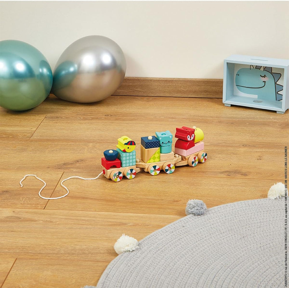 Janod - Baby Forest Holzzug, Nachziehspielzeug, mit 17 Bausteinen, zum Erlernen von Formen und Farbe