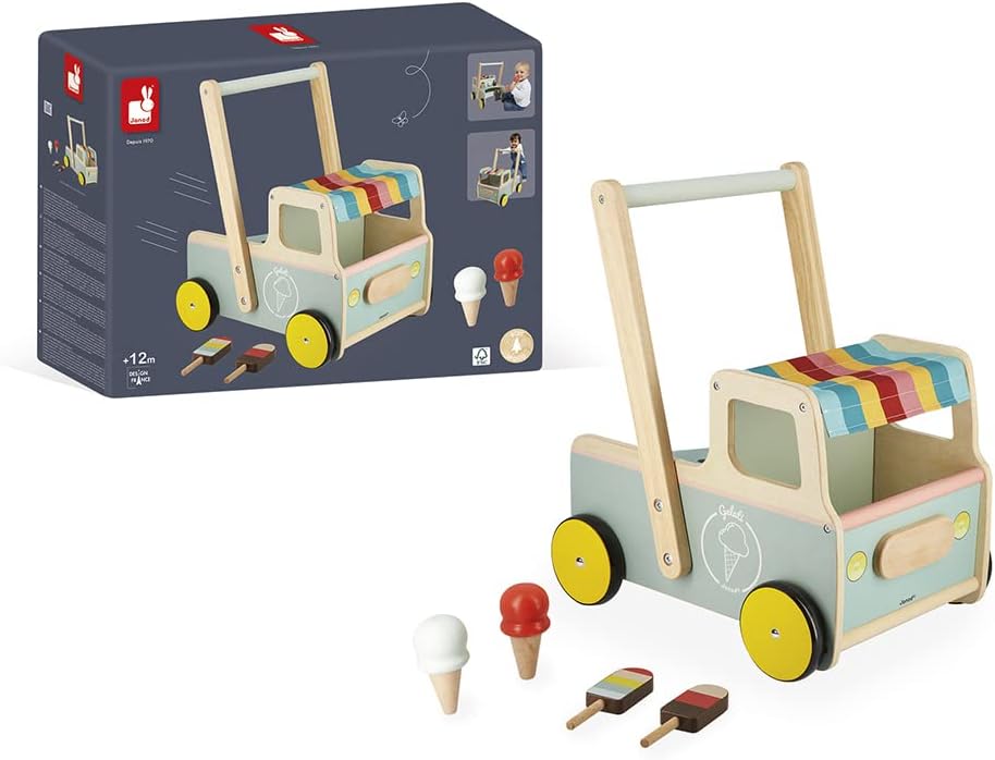 Janod - Eiswagen-Lauflernhilfe aus Holz - 4 Eissorten - Leise Räder - Kippschutzsystem - FSC-zertifi