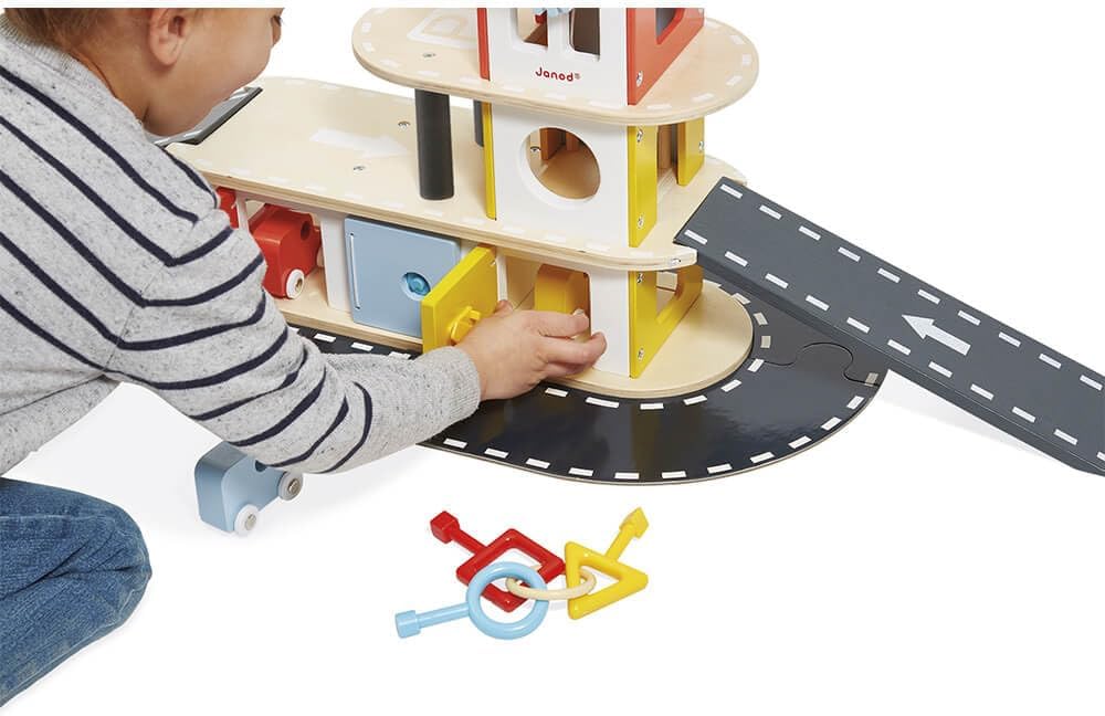 Janod - Bolid Parkhaus aus Massivholz - 3 Autos und 1 Helikopter - Schlüsselkastenfunktion - Fantasi