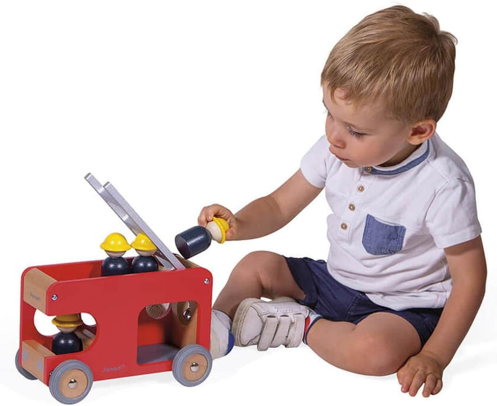 Janod - Bolid Feuerwehrauto aus Massivholz - 6 Feuerwehrleute - Leise Räder - Fantasie und Feinmotor