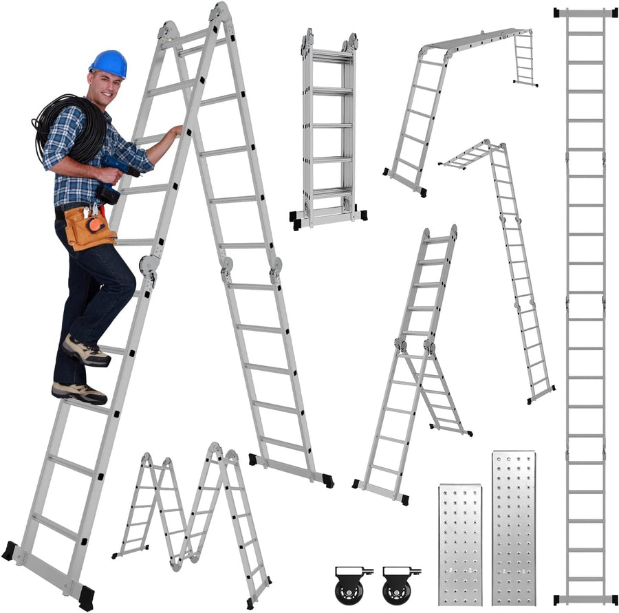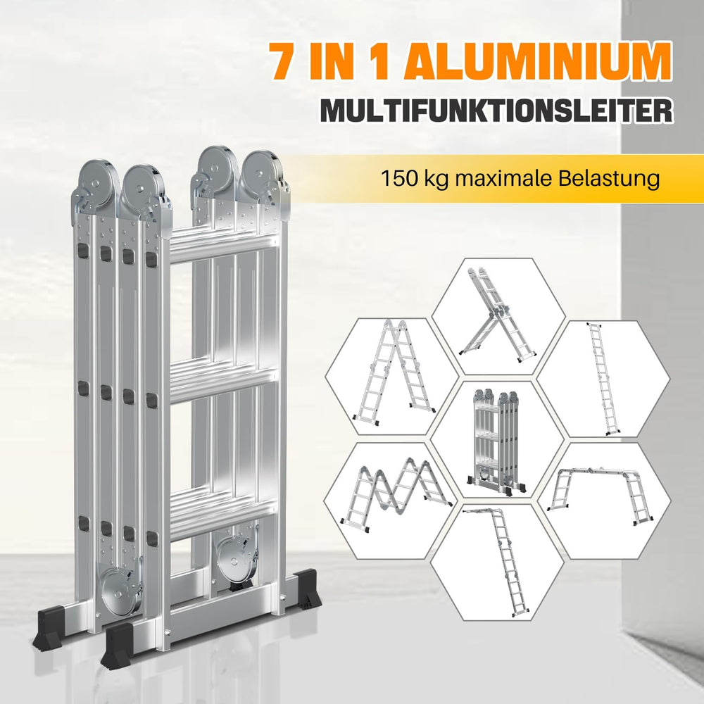 Joparri 4x4 Mehrzweckleiter 470cm 7 in 1 Alu Multifunktionsleiter bis 150 kg mit 2 Transport Rollen