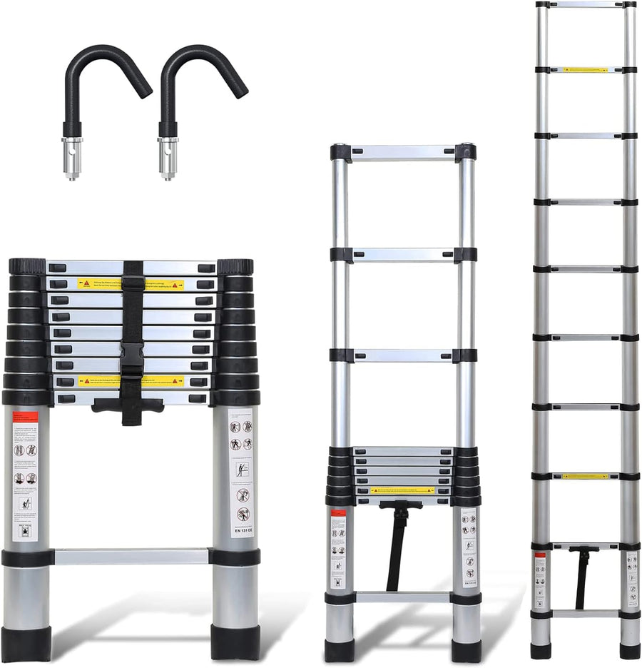 Joparri Aluminium Teleskopleiter mit Abnehmbarem Haken, 2.6M Ausziehbare Leiter, Rutschfester Alulei