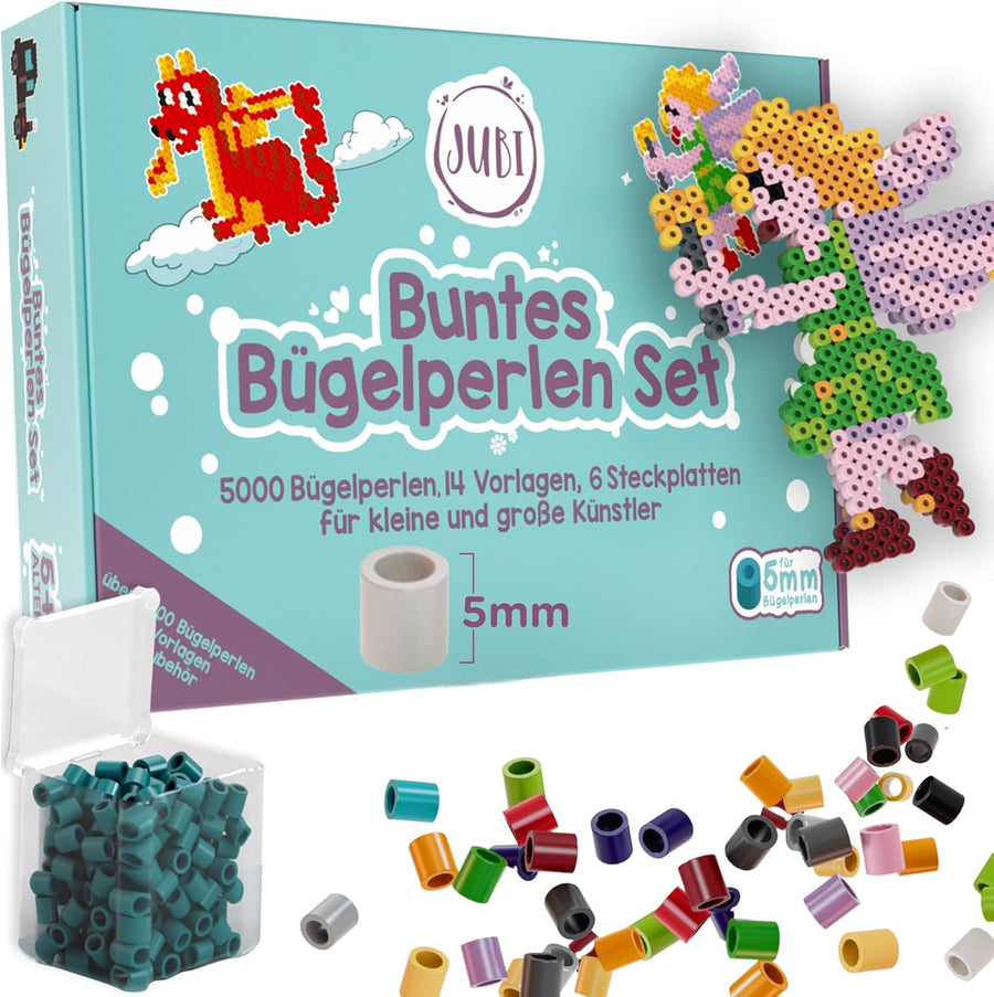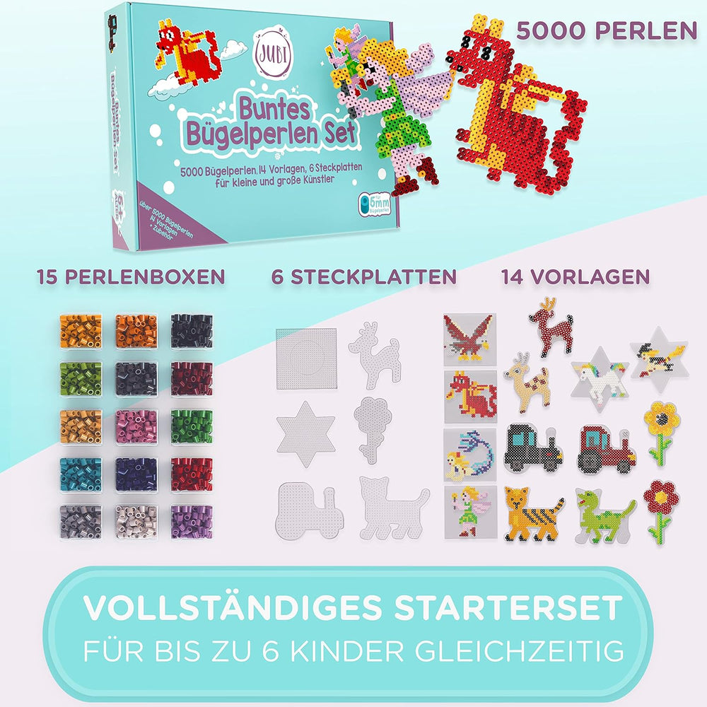 Jubi® Bügelperlen Set | 15 Farben sortiert, 6 Steckplatten, 14 Vorlagen & Zubehör| 5mm Perlen für Ki
