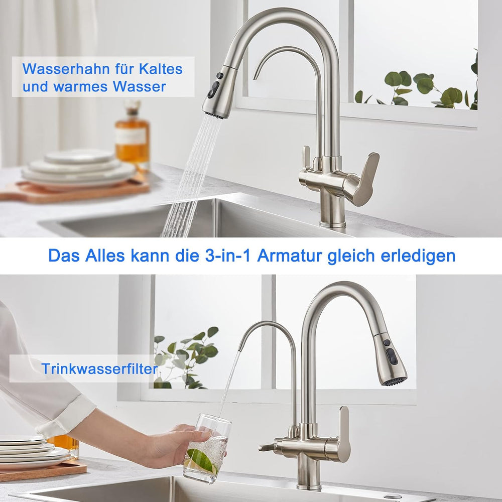 KEOKBON 3 Wege Küchenarmatur mit Ausziehbarer Brause, 3 in 1 Mischbatterie Trinkwasserhahn Küche Was