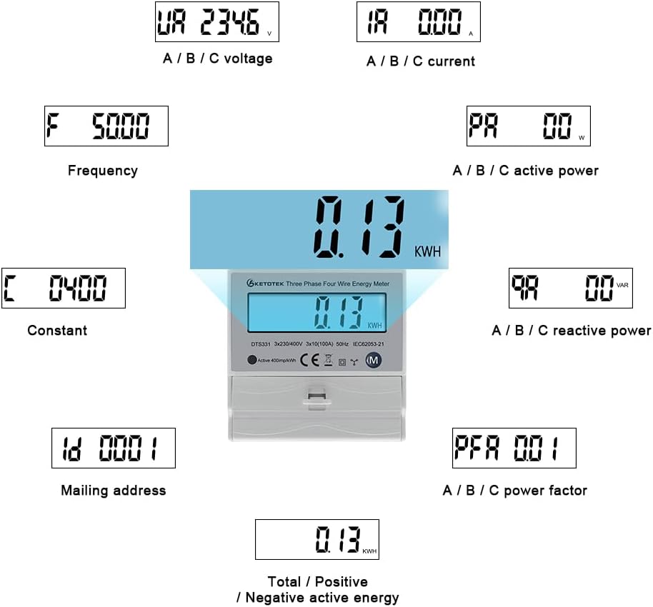 KETOTEK 3 Phasen Stromzähler AC Ampere Volt Leistung Energiemonitor Top Hat Din Rail Bidirektionaler