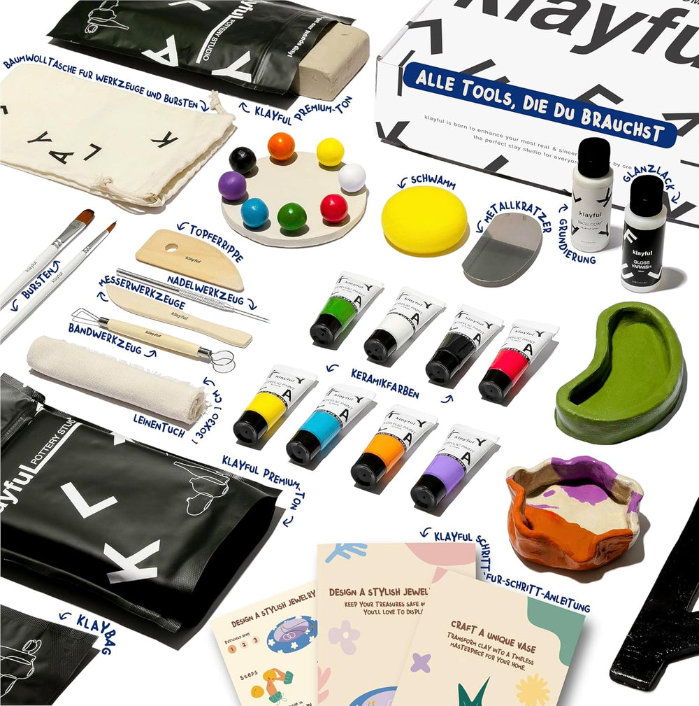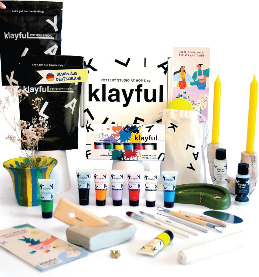 KLAYFUL Ton Töpferset für Anfänger für zu Hause - Lufttrocknend. Das Kit enthält: 3 kg weissen Ton,