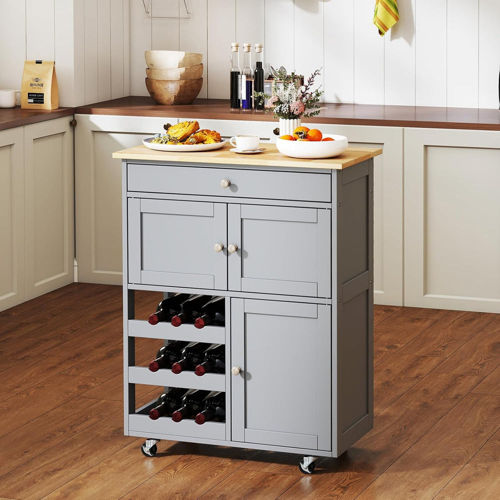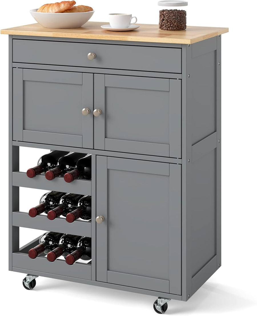 KOMFOTTEU Küchenwagen auf Rollen, Kücheninsel mit Weinregal & 2 Schränke & Schublade, Servierwagen a