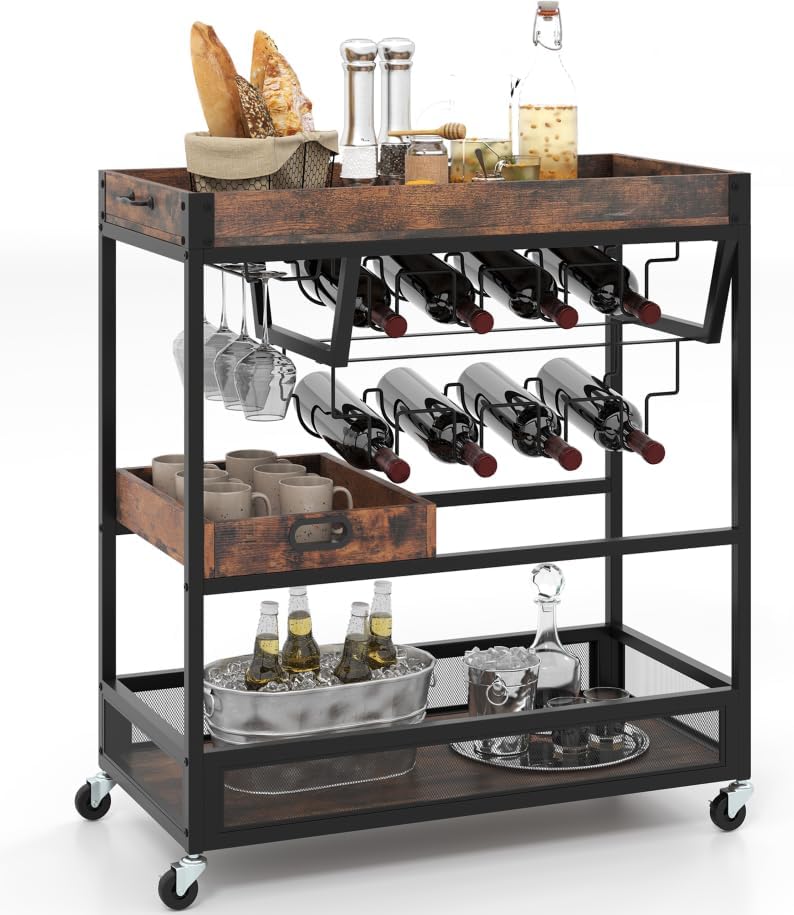 KOMFOTTEU Industrieller Küchenwagen mit herausnehmbarem Tablett, Servierwagen 3 Ebenen mit Weinregal