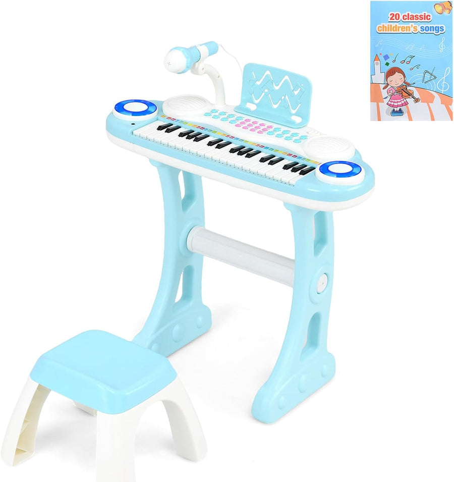 KOMFOTTEU 37 Tasten Kinderklavier Set, Elektronisches Klavier mit Lichteffekten und verstellbarem Mi