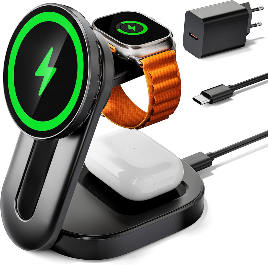 KPON Magsafe Ladestation 3-in-1 Faltbar,15w Magsafe Ladegerät für Apple,Tragbare Schnellladestation
