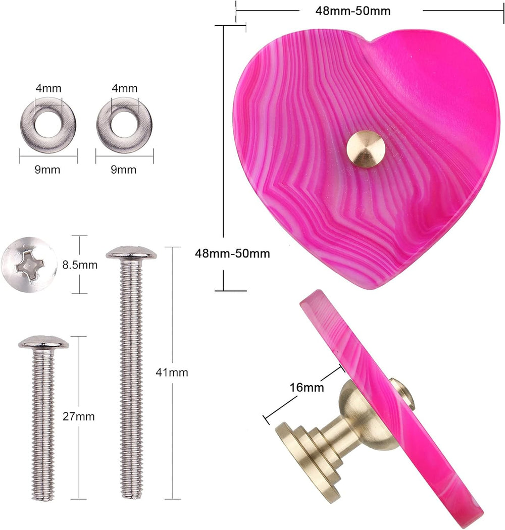 KYEYGWO 4 Stück Rosa Herz Achat Scheiben Möbelknöpfe, Polierte Herzförmig Edelstein Schubladenknöpfe
