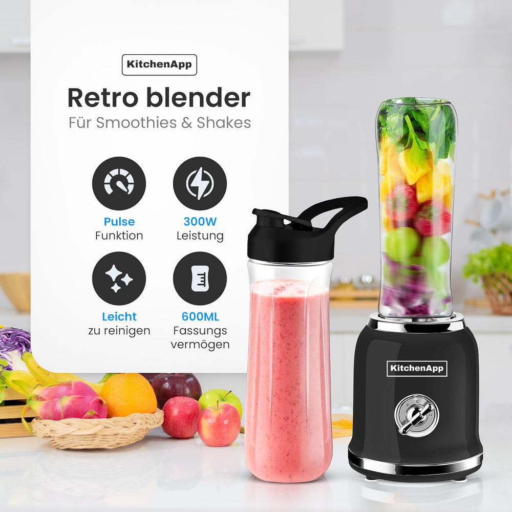 KitchenApp Mixer | Retro-Smoothie-Maker mit 6 Edelstahlklingen | 2 BPA-freie 600-ml-Flaschen | Stand