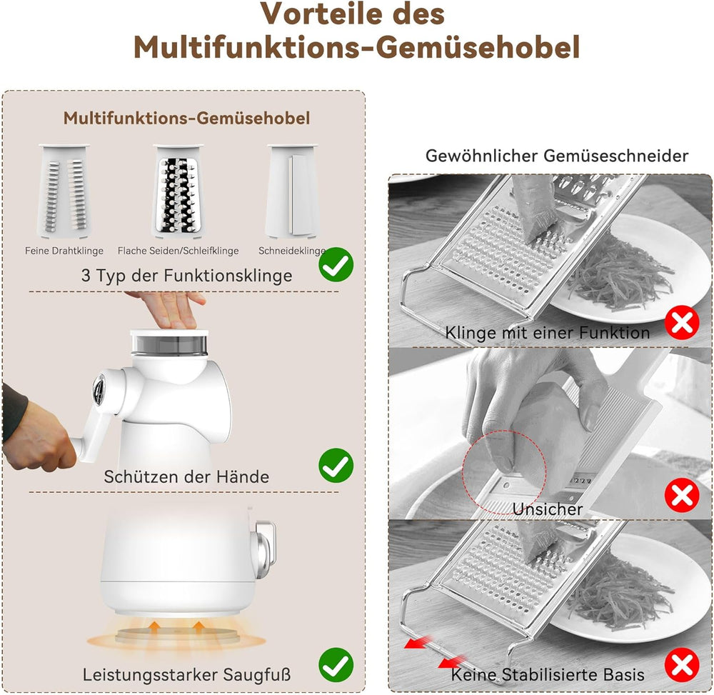 KitchenBoss Gemüseschneider Manuell,Mandoline Gemüsehobel:Käsereibe,Trommelreibe 3 in 1,Geeignet für