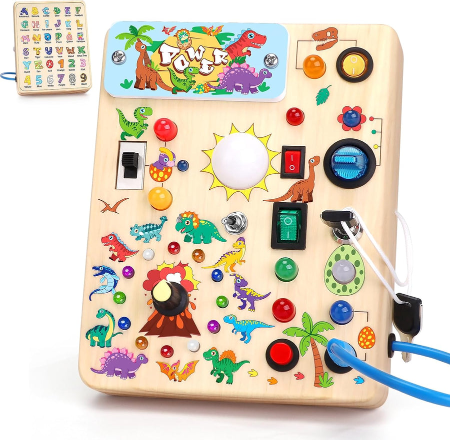 Konijiwa Montessori Busy Board 1 Jahr alt Kinder Activity Board Holzspielzeug mit 8 LED-Lichtschalte