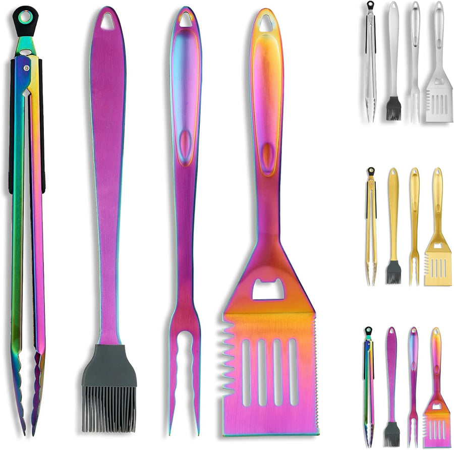 Kyraton Regenbogen Grill Zubehör Kit 4-teilig, Grill Zubehör Set, Titan Bunte Beschichtung Edelstahl