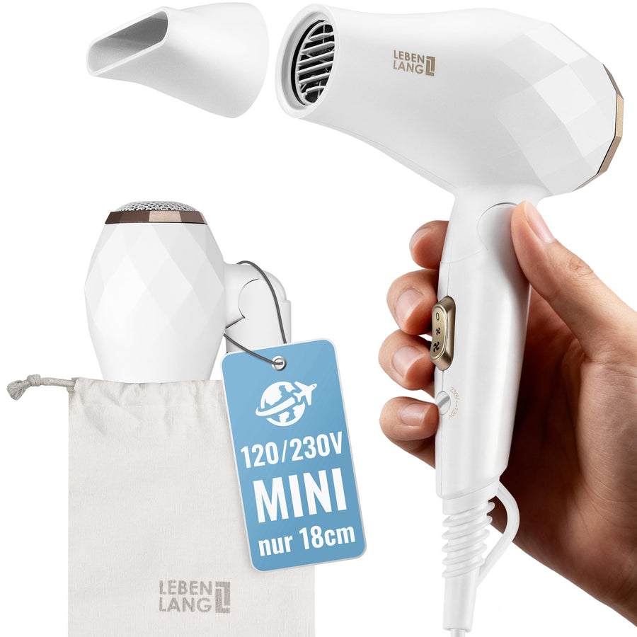 LEBENLANG Reisefön klappbar klein - Duale Spannung & Inkl. Reisetasche mit Stylingdüse I Reise Föhn